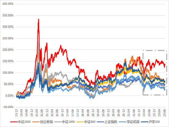 随着产业升级发展不断催生新的产业链,小微公司有望不断崛起,未来成长空间广阔。从历史长期收益表现来看,Wind数据显示,自2013年9月14日至2023年9月13日的近十年期间,中证2000指数总收益达134.52%,同期的沪深300、中证800、中证1000、创业板指总收益为50.13%、49.33%、40.21%、61.77%,明显可以看出中证2000指数的长期表现更好,收益率在A股主流宽基指数中遥遥领先。