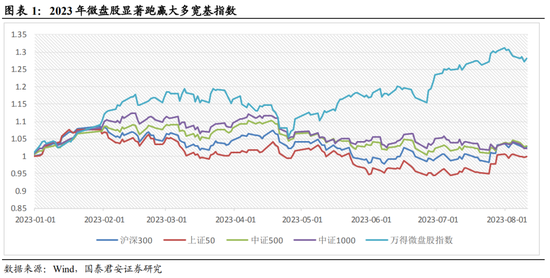 2021年以来,市场上以小微盘风格为代表的“小而美”强于“大而优”,超额收益显著。国泰君安证券研报显示,2023年初至8月期间,万得微盘股指数大涨,收益远超中大盘为代表的沪深300指数,同时也远超中证500、中证1000等主流指数表现。