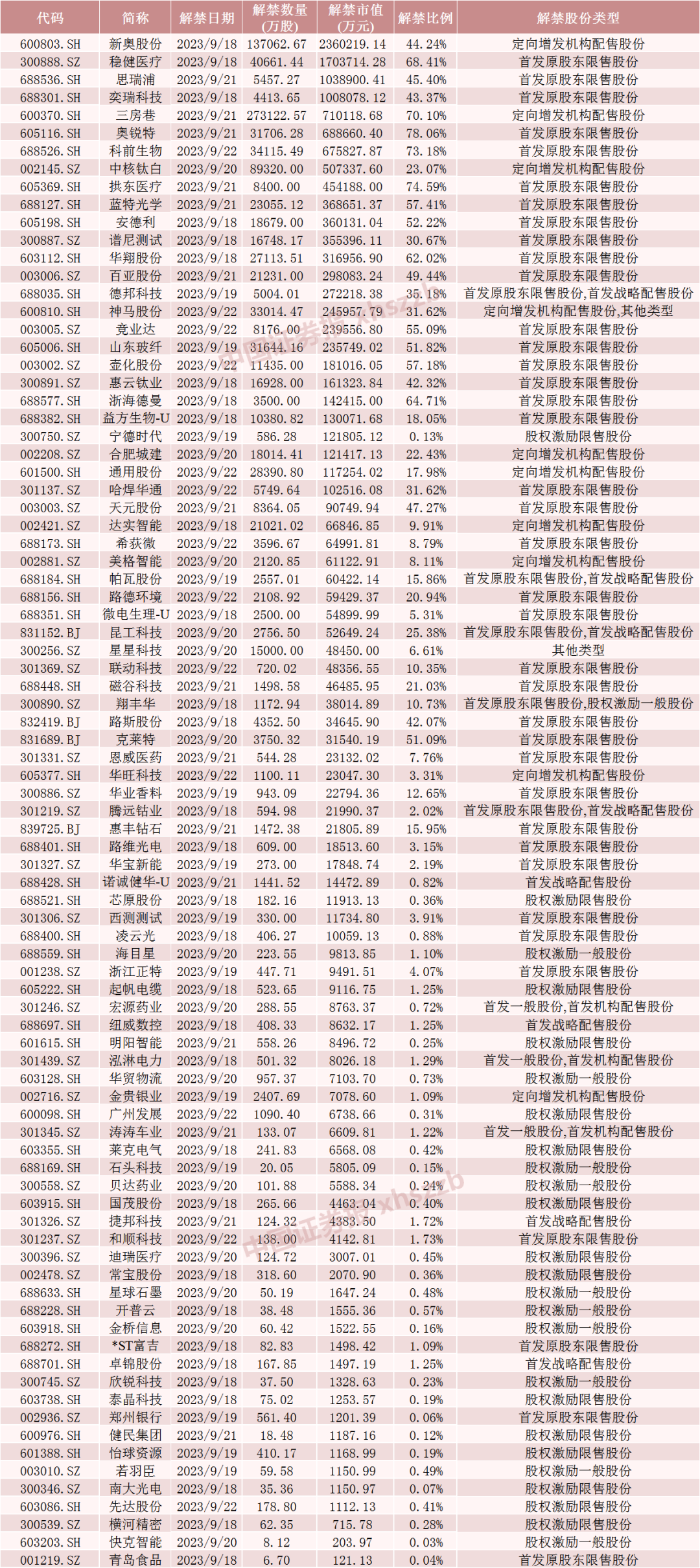 Wind数据显示,新奥股份9月18日将解禁13.71亿股,均为定向增发机构配售股份。稳健医疗9月18日将解禁4.07亿股,均为首发原股东限售股份。思瑞浦9月21日将解禁5457.27万股,均为首发原股东限售股份。奕瑞科技9月18日将解禁4413.65万股,均为首发原股东限售股份。
