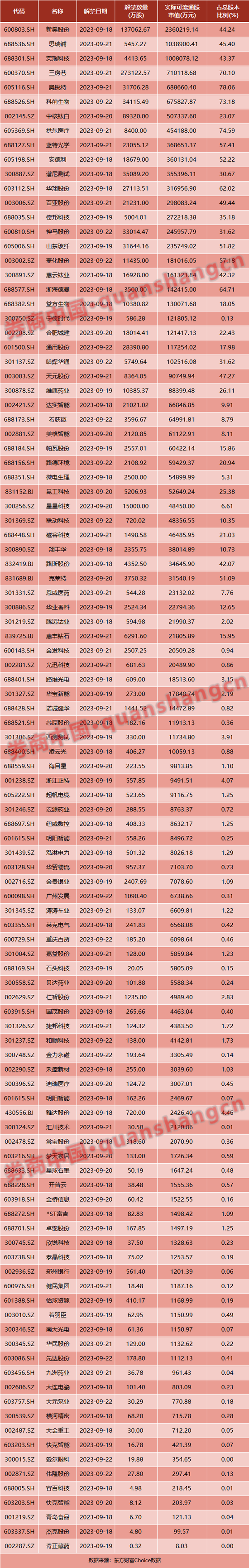 数据显示,本周(9月18日~9月22日)共有106家公司限售股陆续解禁,合计解禁量98.97亿股,按9月15日收盘价计算,解禁市值为1221.86亿元。