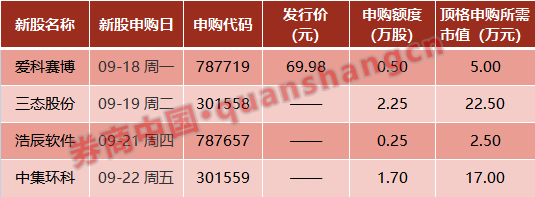 本周(9月18日~9月22日)共有4只新股申购。具体来看,周一1只:爱科赛博;周二1只:三态股份;周四1只:浩辰软件;周五1只:中集环科。