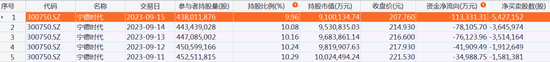 宁德时代为本周北向资金减仓金额最大的个股,持股数减少1608.13万股,减仓金额达34.45亿元。从明细数据来看,本周北向资金连续5个交易日减仓宁德时代,其中9月15日减仓超11亿元。