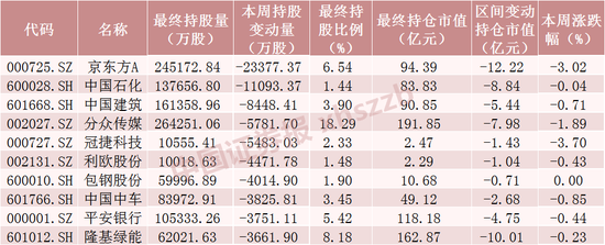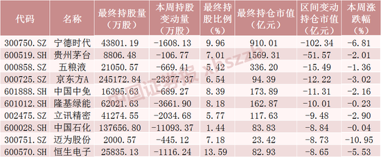 本周持仓市值减少额居前十的股票均被北向资金减仓,其中宁德时代、京东方A、隆基绿能、立讯精密、中国石化、恒生电子被北向资金减仓超1000万股。