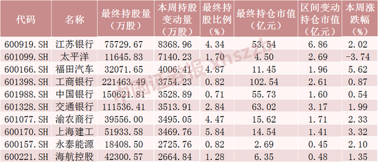 本周北向资金对1494只股票的持股数增加,对其中47只股票的持股增加数超过1000万股,持股增加数最多的江苏银行增加了8368.96万股,对太平洋、福田汽车持股分别增加7140.23万股、4006.41万股。
