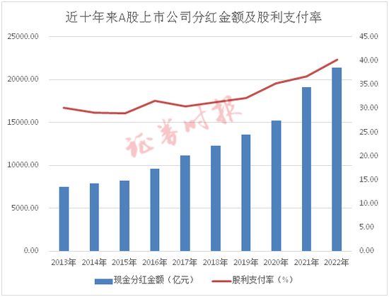 持续稳定的高分红不仅能体现出上市公司业绩稳健、现金流充裕的实力,还彰显出上市公司长期稳定的成长性与内在投资价值。而从股利支付率看,近十年,A股上市公司股利支付率不断增长,2022年达到40.30%,较2013年的30.08%增长明显。