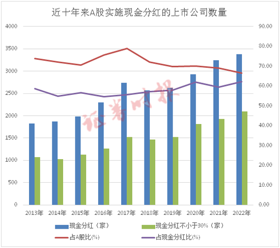 据Wind数据,2013年,A股有1825家上市公司实施现金分红,占A股总数的73.95%。2022年A股有3377家上市公司实施现金分红,占A股总数的66.65%。可以看出,近十年,A股实施现金分红的上市公司数量不断增多。