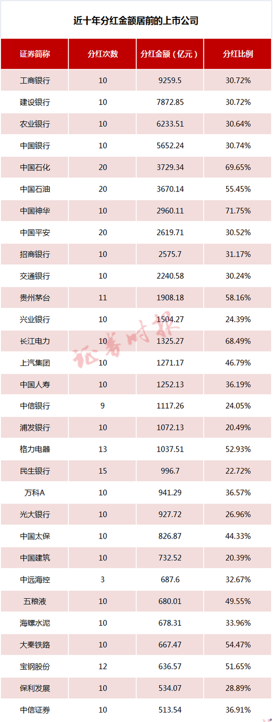 煤炭龙头中国神华、白酒龙头贵州茅台、电力龙头长江电力、家电龙头之一格力电器等同样高比例分红,近十年累计分红金额超千亿元。