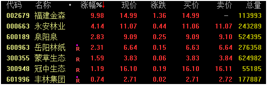 CCER产业链股午后快速拉升,截至收盘,福建金森涨停,永安林业(维权)涨约4%,泉阳泉涨近3%,岳阳林纸涨超2%。