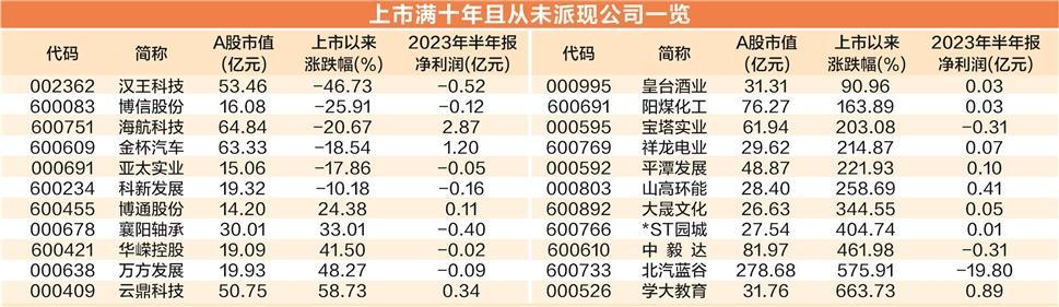 数据宝统计,A股历史上,上市时间在十年以上,且从未实施派现的公司有22家。这22家公司上市以来净利润均没有实现持续盈利,其中非国有企业占比超过半数。