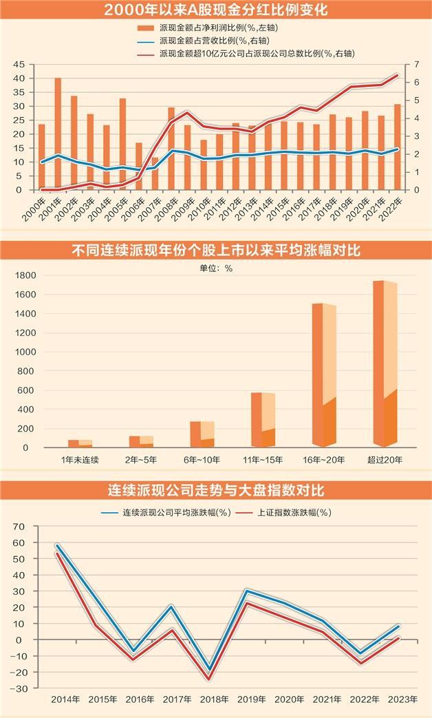 数据宝统计,从2023年往前按年类推,连续派现超二十年的公司上市以来平均涨幅17.5倍排在第一位;2023年有派现但未连续的公司涨幅最低,上市以来平均涨幅仅75.4%。