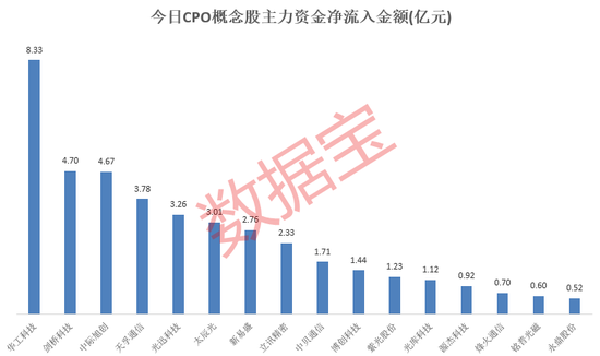资金也密集流入CPO概念股。华工科技主力资金净流入额高达8.33亿元,位居A股全市场第二;剑桥科技、中际旭创主力资金净流入4亿元以上,双双进入A股市场前十。