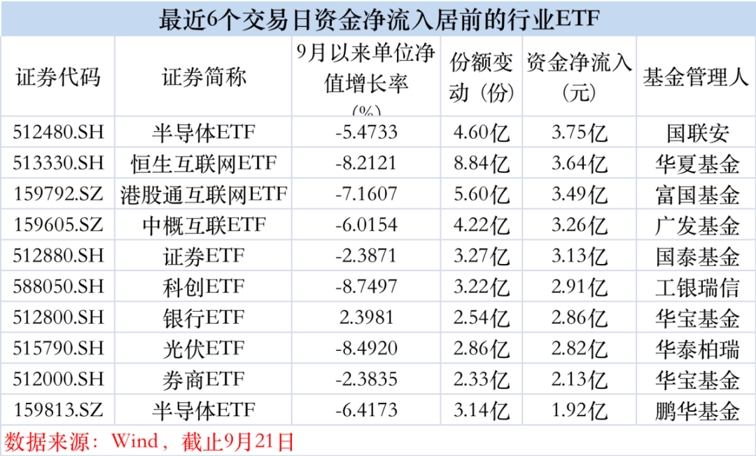 Wind数据显示,截止9月21日,包括国联安半导体ETF、华夏恒生互联网ETF、富国港股通互联网ETF在内的3只行业ETF最近6个交易日资金净流入较多,分别达到3.75亿元、3.64亿元、3.49亿元,广发中概互联ETF、国泰证券ETF资金净流入也相对靠前。