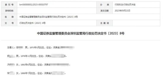 最终,深圳证监局决定对李某、杨某分别处以110万元罚款,对冯某、宋某分别处以10万元罚款。4人共计被罚款240万元。