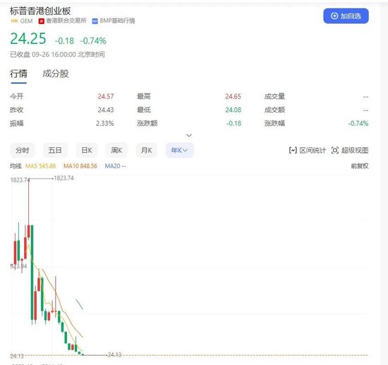 香港创业板成立于1999年,截至目前,共有超330家上市公司。截至9月26日收盘,标普香港创业板指数报24.25点,年内跌幅超28%,较1824点的历史高位跌超98.7%。有网友表示,这一指数跌得“只剩高峰时期零头”。