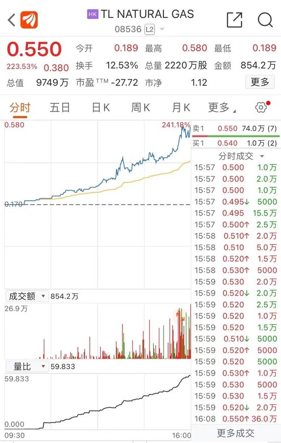 今日盘中,港股两只香港创业板股票翻倍。其中,TL NATURAL GAS收盘暴涨223.53%,报0.55港元/股,成交额854.2万港元,总市值报0.97亿港元。瑞强集团盘中涨超127%,不过猛涨的势头仅维持了一个多小时,临近尾盘涨幅回落,全天经历了“平开、暴涨、平收”的戏剧性过程,收盘报0.088港元/股,总市值1199万港元,全天成交额仅1.4万港元。
