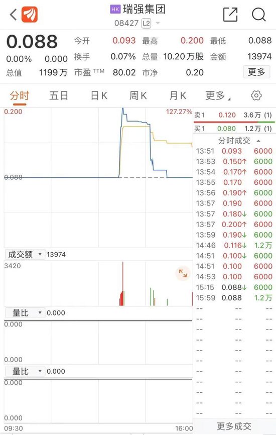 港股流动性问题日趋严峻,香港创业板个股常出现“零成交”状况,瑞强集团也不例外。Choice数据统计,今年176个交易日中,该公司仅有76个交易日有成交量,另外100个交易日没有成交量。