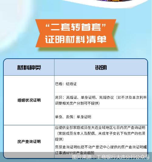 “二套转首套”证明材料清单通常包括婚姻状况证明、房产查询证明等,由于地区不同,各地分行提交的材料也有所不同。针对离异的借款人,工商银行大连分行要求提供离婚证、单身证明、离婚协议;在房产查询证明中,该分行要求,应提供全部家庭成员在大连全域地区七日内房产查询证明(家庭成员含本人及配偶,未成年子女名下有房产的也须房产查询证明提供)。