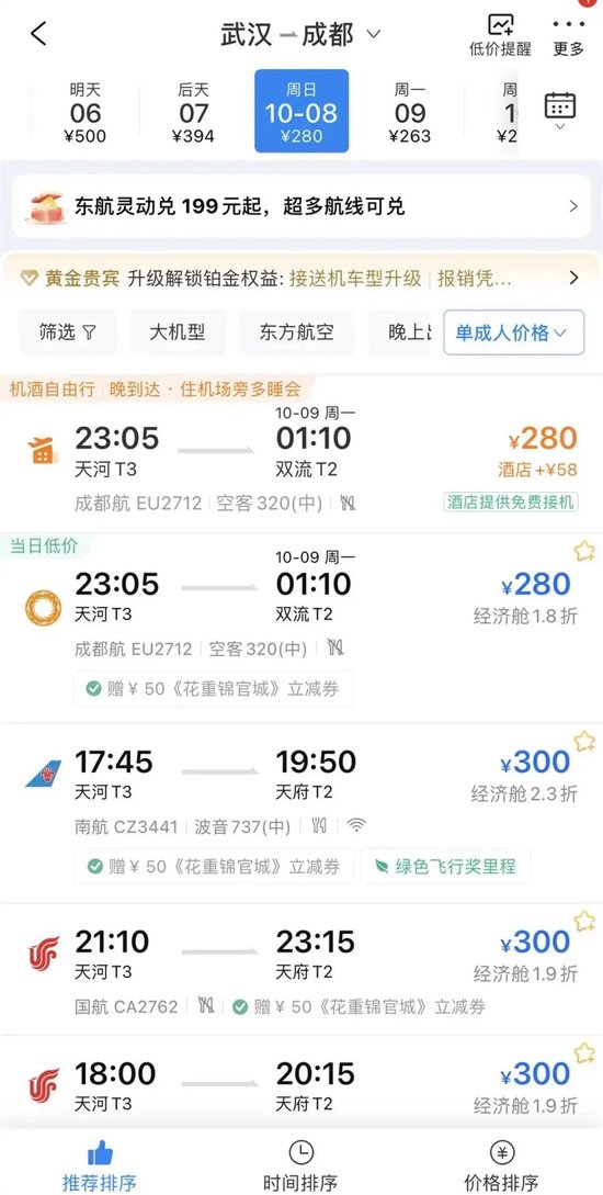 假期过后,部分航线的机票票价比火车票价还便宜。以武汉至南宁为例,乘坐高铁二等座的票价为486元,耗时7小时左右,并且高铁票价高于节后最低航班票价的150元。武汉至成都的复兴号高铁票价为643元,耗时7个小时左右,而飞往成都的航班最低票价为280元。