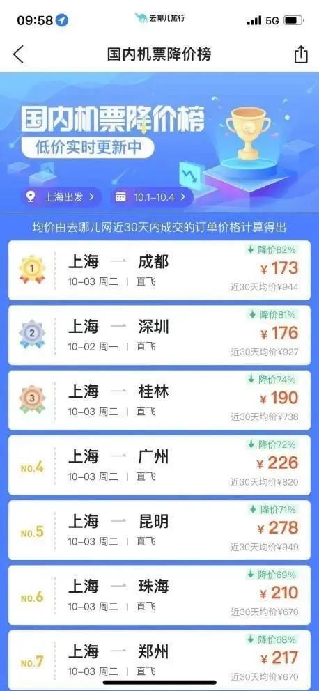 据第三方旅游平台“去哪儿”显示,今年中秋国庆节中有不少出行热门航线现百元低价机票,尤其是10月1日、2日、3日,机票价格为洼地。例如,节中沪蓉、沪深航线有航班价格和假期首日相比降幅超八成,裸票价格部分不超200元,而京兰、京深等长线节中有航班价格和假期首日相比,降幅超七成,裸票价格均降至500元以内。