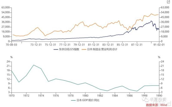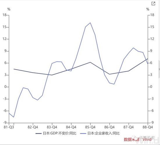 82年后,日本国内经济增长显著放缓,从82年前后的平台算起,直到90年,日本国内的制造业利润只增长了50%,但日本股指上涨了5倍。