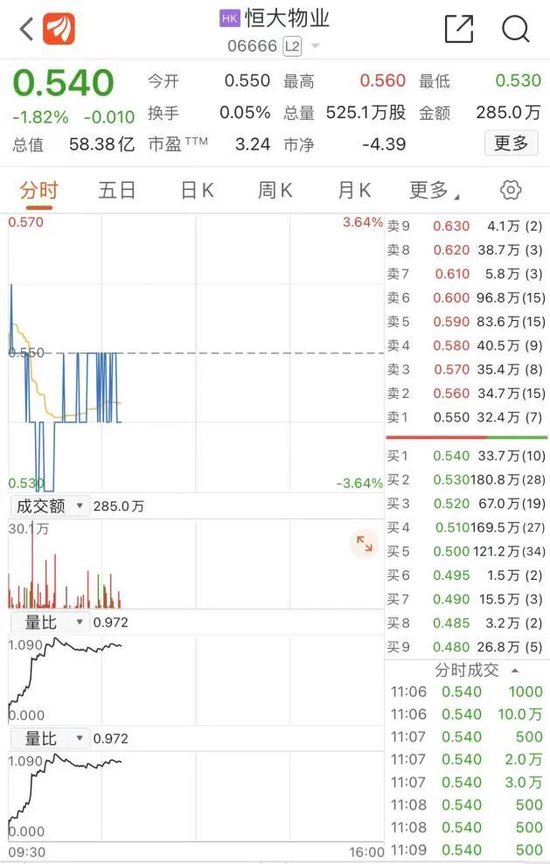中国恒大一度跌超10%,截至发稿探底回升,跌约3%,报0.31港元/股,总市值40.93亿港元。10月5日、10月6日,中国恒大均尾盘跳水,分别跌11.11%、3.12%。两个半交易日,中国恒大已经抹去10月3日复牌涨幅。恒大物业一度跌超3%,截至发稿,恒大物业跌1.82%。