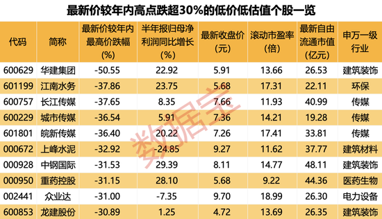 鉴于此,数据宝在上述板块中,筛选出年内自高点跌幅超过30%、股价低于10元、自由流通市值低于50亿元、2023年半年报净利润增幅高于-30%且滚动市盈率低于20倍的非ST股(不含北交所个股),共计10股。