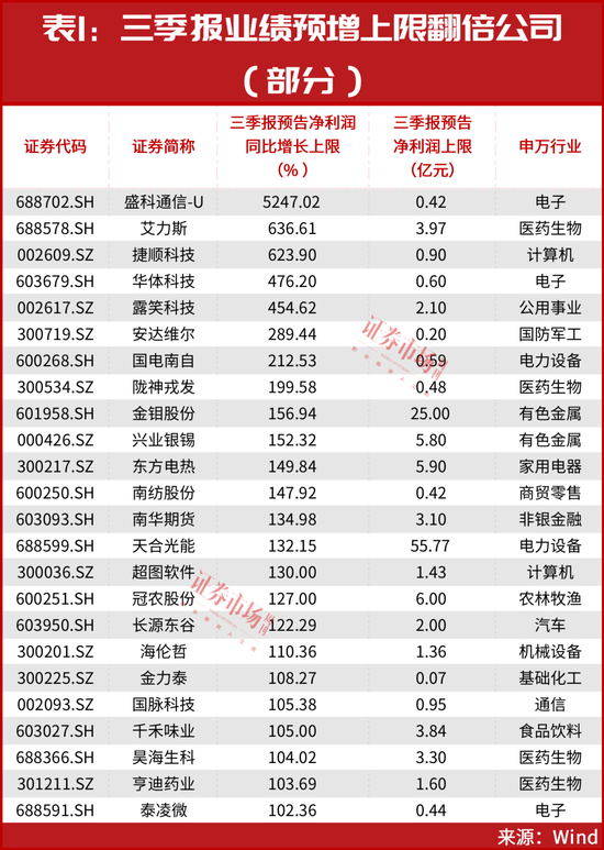 从业绩预增幅度来看,包括盛科通信-U、航亚科技、艾力斯、捷顺科技、华体科技、露笑科技、安达维尔等在内的26只个股,三季报业绩均预计有望实现翻倍增长(见表1)。另外,从净利润实现额来看,包括立讯精密、天合光能、国电南瑞、传音控股、金钼股份、小商品城、双良节能、杭叉集团等在内的11家公司,盈利额均有望超过10亿元。其中,立讯精密、天合光能的盈利能力最强,三季报净利润均预计超过50亿元,分别为76.80亿元、55.77亿元。