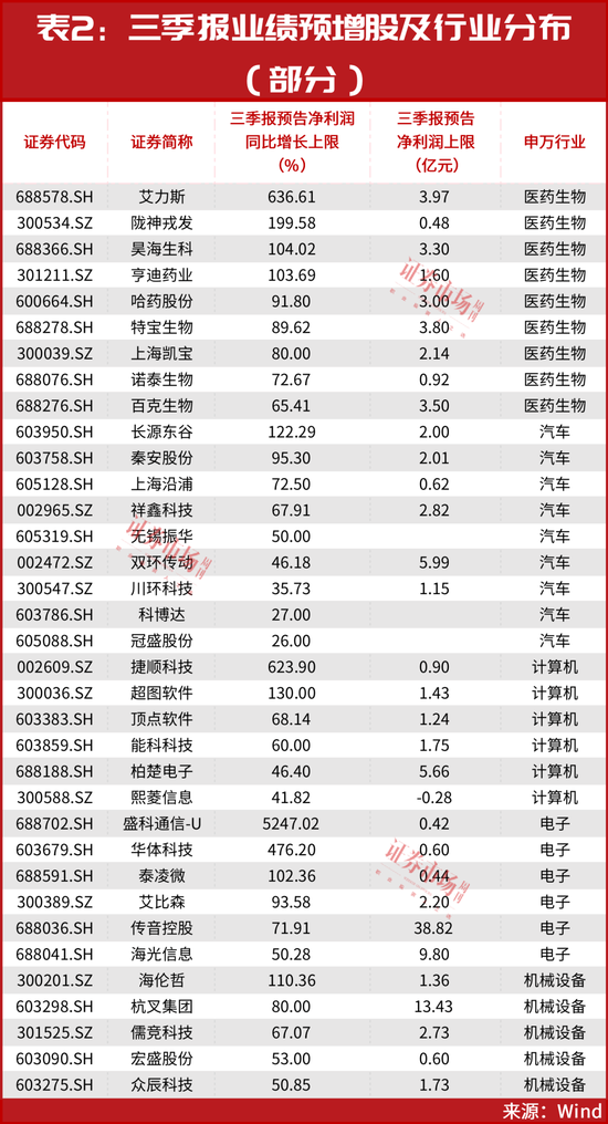 与此同时,上市公司三季报的业绩预告也在密集发布,数据显示,截至目前,已有超140家公司发布了三季报业绩预告,整体“成绩单”喜人。据不完全统计显示(剔除盈利不确定的标的,下同),有近百只个股三季报预增上限为正值。