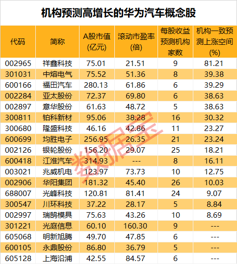 这19股中,滚动市盈率低于30倍的有4股,包括祥鑫科技、均胜电子、川环科技、银轮股份。最新收盘价与机构一致预测目标价相比,祥鑫科技、中熔电气、福田汽车、亚太股份、意华股份、铂科新材上涨空间逾30%。
