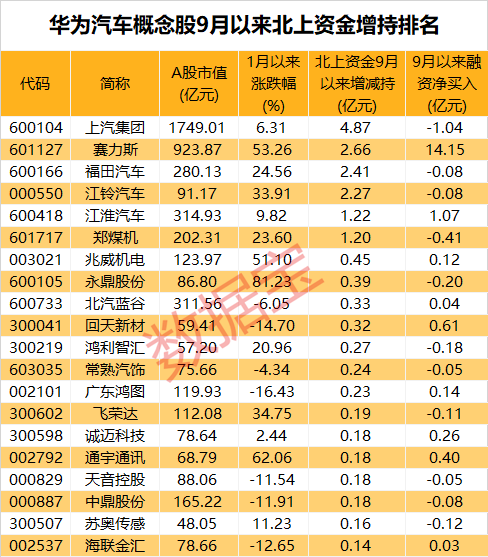 资金面上来看,近期部分股票获得北上资金、融资资金加仓。数据宝统计,按照区间成交均价计算,北上资金9月以来加仓超亿元的华为汽车概念股有6只,分别是上汽集团、赛力斯、福田汽车、江铃汽车、江淮汽车、郑煤机。同期融资净买入超亿元的也有6只,分别是赛力斯、润和软件、光弘科技、高鸿股份、江淮汽车、铭普光磁(维权)。