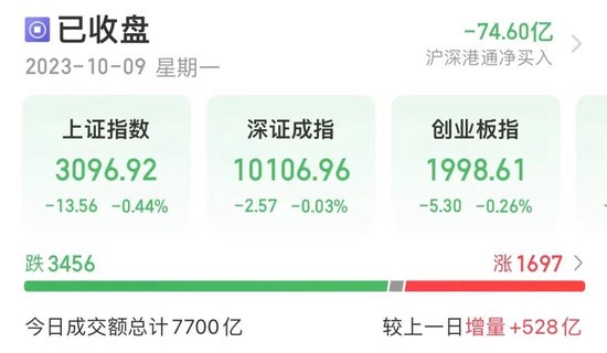国庆节后首个交易日,A股整体涨少跌多。上证指数盘中一度跌超1.2%,收盘跌幅收窄至0.44%。北向资金14时恢复交易,全天净卖出74.6亿元。
