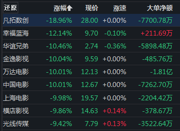 传媒板块跌幅居前,上海电影、中国电影、万达电影均跌停。