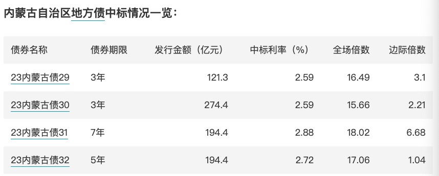 10月9日,内蒙古特殊再融资债(663.2亿,均为一般债,“23内蒙古债30”、“23内蒙古债31”、“23内蒙古债32”)已成功发行。其中“23内蒙古债29”用于偿还地方政府债券本金,属于普通再融资债券,其和特殊再融资债券“23内蒙古债30”的期限一致,二者的中标利率一致,全场倍数、边际倍数相差也不大。