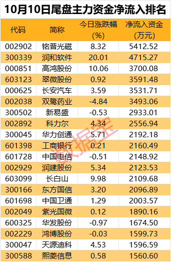 个股方面,铭普光磁(维权)、润和软件、高鸿股份、翠微股份、长安汽车、双鹭药业6股尾盘获主力抢筹超3000万元。