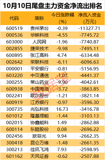 贵州茅台、华映科技、人民网、捷荣技术、张江高科等尾盘主力资金净流出均超6000万元。