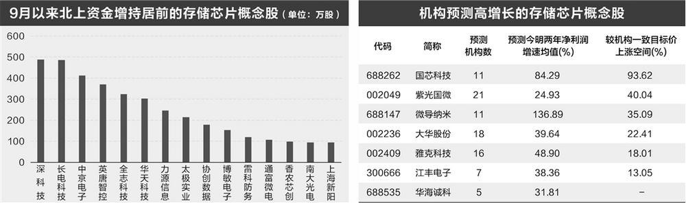 部分存储芯片概念股获得北上资金加仓,深科技、长电科技、中京电子等9股9月以来累计获得加仓100万股以上。