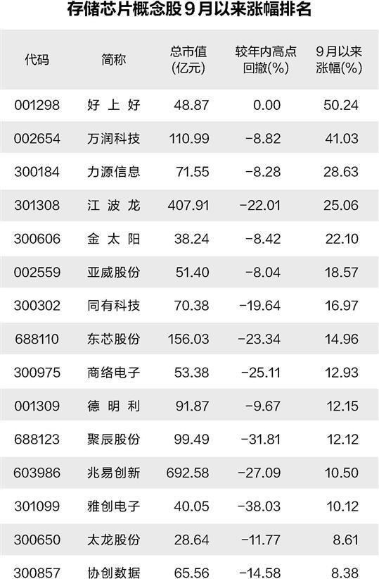 近期,部分存储芯片概念股已率先发力。证券时报·数据宝统计,截至10月10日收盘,9月以来存储芯片概念股平均上涨4.08%,跑赢同期上证指数5.51个百分点。13只概念股累计涨幅超10%,好上好、万润科技、力源信息、江波龙、金太阳等概念股涨幅甚至超过20%。
