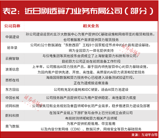 此外,中装建设、易华录、云赛智联、浪潮信息、首都在线、东方国信(维权)、中国长城等多家公司也在近期剧透在算力方面的相关布局(见表2)。