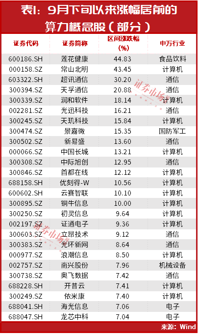 莲花健康股价被热炒背后,市场对于算力板块的整体关注度也在升温。自9月下旬以来(截至10月11日,下同),算力板块即开启了持续反弹模式,截至目前,已累计上涨超6%。部分个股更是迎来强势上涨,如莲花健康、常山北明、超讯通信(维权)、天孚通信等期间涨幅均超过20%,润和软件、光迅科技、天玑科技、景嘉微、新易盛、中国长城、中际旭创等多只个股涨幅均超过10%(见表1)。
