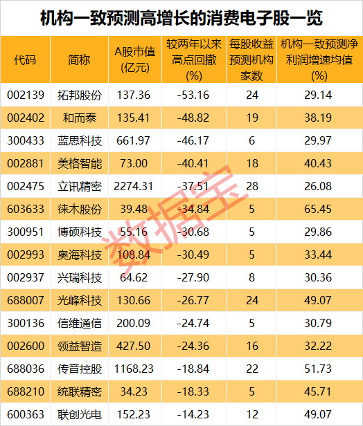 根据5家以上机构一致预测,部分消费电子股业绩值得期待。数据宝统计,15股今明两年净利润增速均有望超过20%,2只市值超千亿的龙头股立讯精密、传音控股入围。