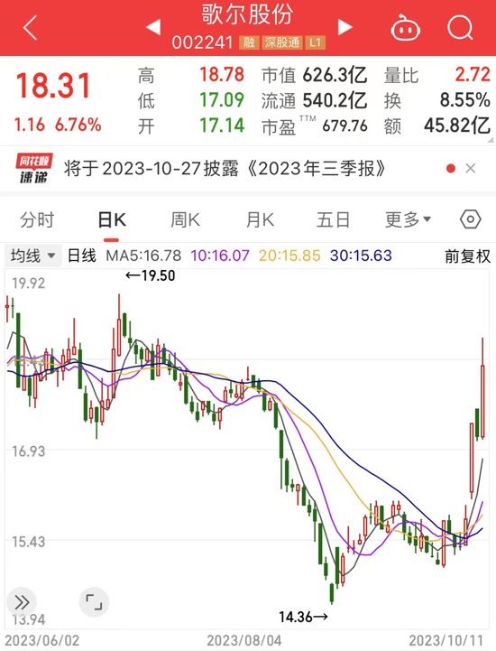 10月11日,歌尔股份盘中逼近涨停,收盘涨6.76%,最新A股市值回到600亿元以上;全天成交额达45.82亿元,量比为2.72倍。