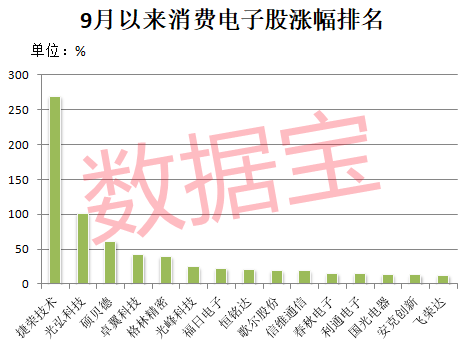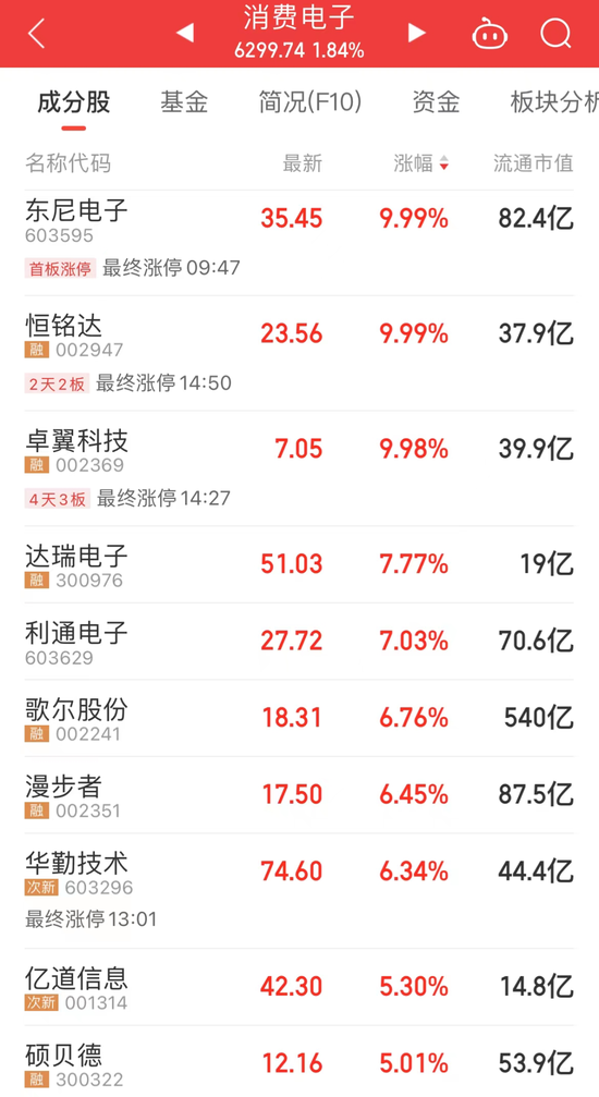 证券时报·数据宝统计,近期消费电子股整体呈现上行走势。今日盘面上,恒铭达、东尼电子、卓翼科技涨停,利通电子、漫步者、华勤技术、亿道信息、硕贝德等涨超5%。