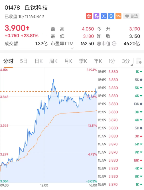 10月11日周三,手机概念股表现亮眼,丘钛科技收涨23.81%领衔,报3.9港元,市值46.2亿港元。