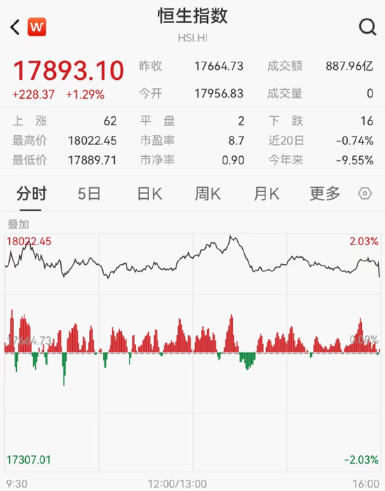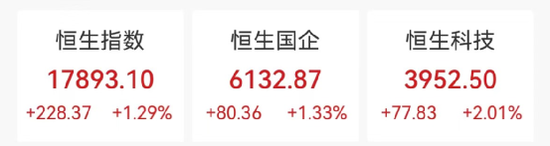 截至收盘,恒生指数涨1.29%,报17893.1点,涨228.37点,盘中一度逼近18000点关口;恒生科技指数涨2.01%,国企指数涨1.33%。三者均录得5连涨。