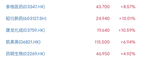 10月11日周三,港股医药股全天升幅明显,昭衍新药涨超12%,康龙化成涨超10%,药明生物涨近5%,泰格医药、药明康德(维权)等跟涨。