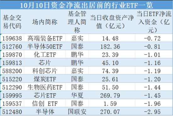 银河证券基金研究中心数据显示,10月10日,国联安半导体ETF、华夏芯片ETF、嘉实科创芯片ETF、鹏华芯片ETF均有1-2亿元不等的资金净流出。