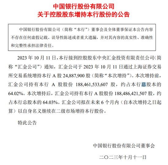 中国银行公告,汇金公司于2023年10月11日通过上海证券交易所交易系统增持本行A股24,887,900股。本次增持前,汇金公司持有本行A股股份188,461,533,607股,约占本行总股本的64.02%。本次增持后,汇金公司持有本行A股股份188,486,421,507股,约占本行总股本的64.03%。汇金公司拟在未来6个月内(自本次增持之日起算)以自身名义继续在二级市场增持本行股份。