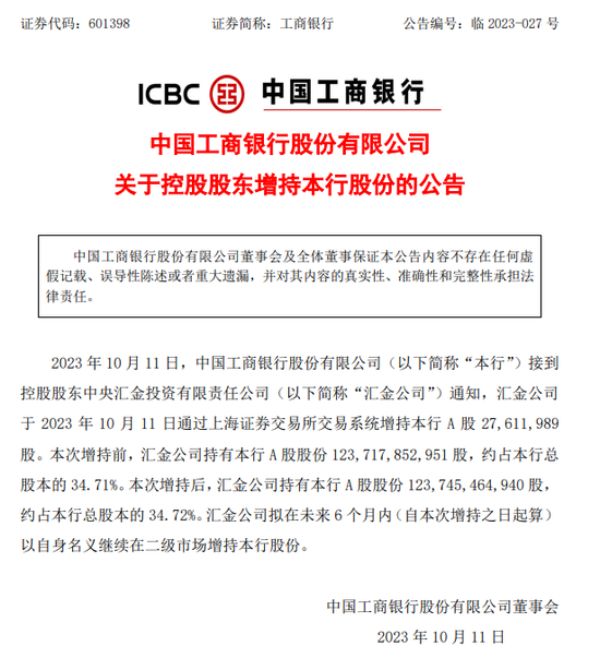 工商银行公告,控股股东汇金公司10月11日增持本行2761万股A股股份,拟在未来6个月内(自本次增持之日起算)以自身名义继续在二级市场增持本行股份。