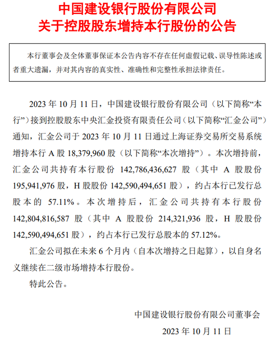 建设银行公告,控股股东汇金公司10月11日增持本行1838万股A股股份,拟在未来6个月内(自本次增持之日起算),以自身名义继续在二级市场增持本行股份。