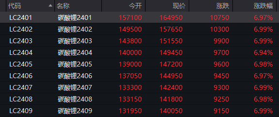 值得注意的是,期货市场方面,碳酸锂多个月份合约罕见悉数涨停,其中主力合约LC2401收于16.495万元/吨,持仓量约7.6万手,日内资金流入1.67亿元。